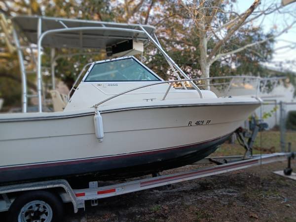 Boat is sitting on a nice dual axle Aluminum trailer. Cuddy cabin is in good condition. Asking $5 000 obo